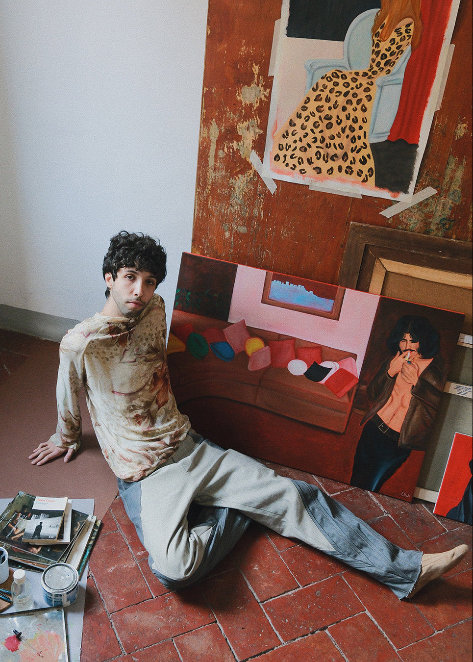 Elie’s work is unapologetically eclectic, drawing on both Western and Middle Eastern influences. Through bold contrasts, symbolic forms, and layered narratives, his practice explores themes of identity, nostalgia, societal pressure, and sexual selfhood. These ideas are mirrored in the garments he wears—pieces from Absent Findings that embody both softness and structure. A flowy silk blouse, crafted from a heritage sari, echoes the lyrical motion of his brushstrokes. In contrast, tailored denim trousers ground the look in form and intent, evoking the clarity and boldness present in his work.